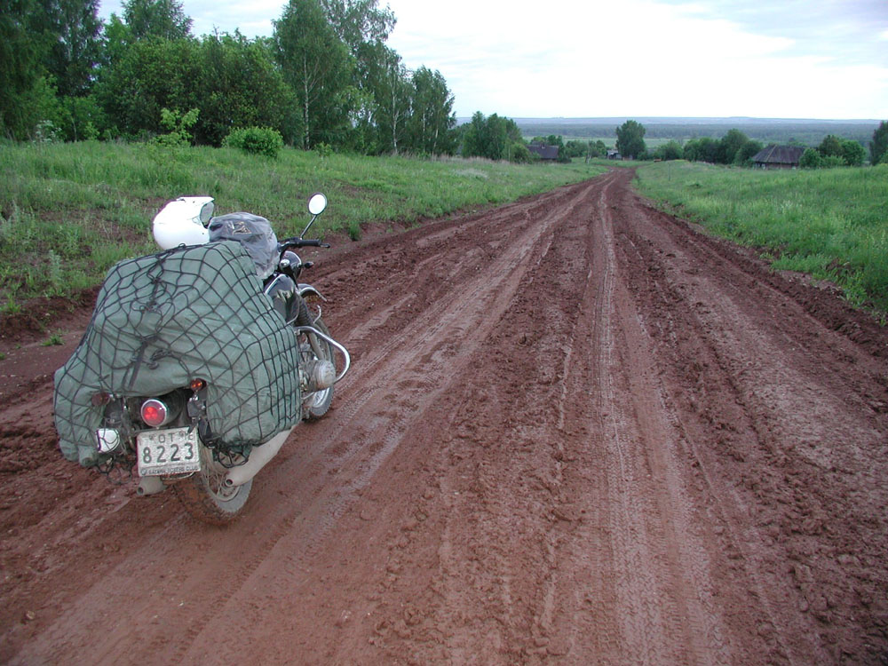 ウラル山脈を越えた下り道だが、この泥がヌルヌルでよく滑る。下り終えるまでに何度かこけたが、向こうに平野がみえてホッとした瞬間だ。