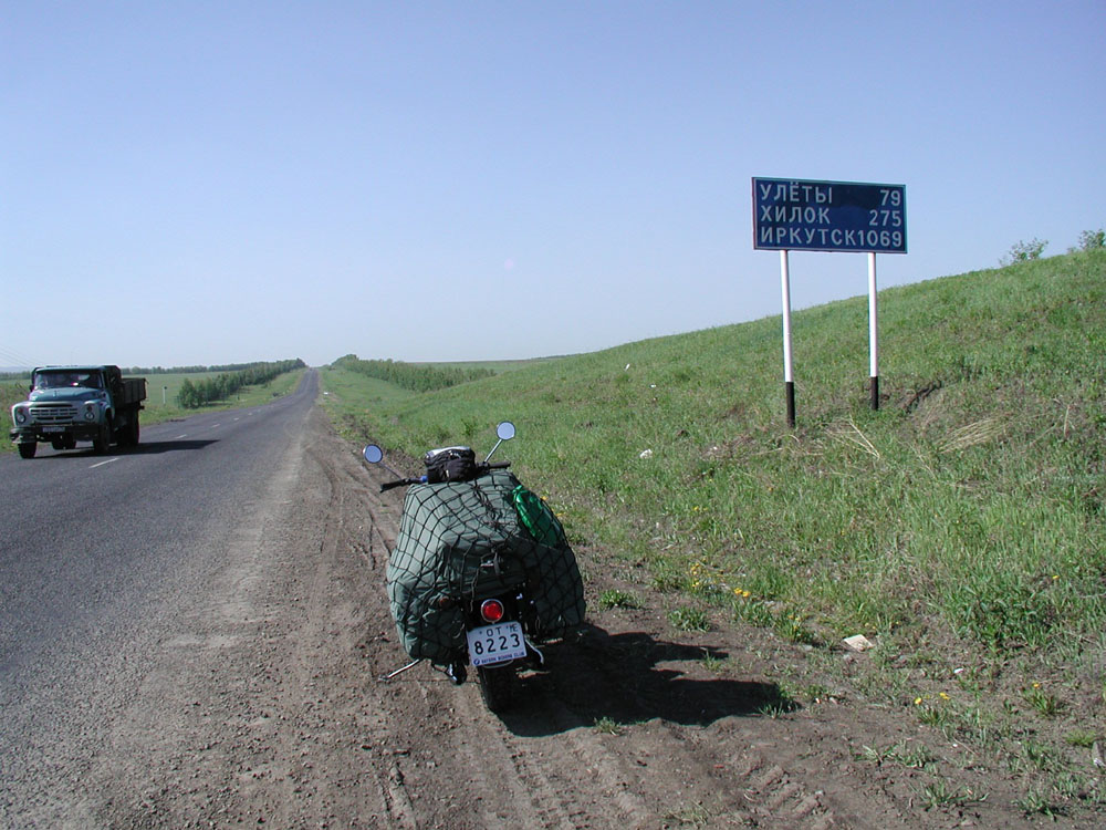 バイカル湖と大都市イルクーツクはもう近い。イルクーツクまで1,069kmを示す道路標識。
